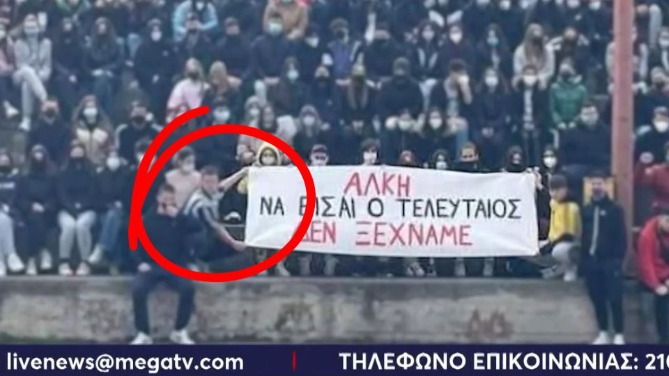 Η εικόνα, που τραβήχτηκε πριν από περίπου τέσσερα χρόνια, δείχνει μαθητές του 2ο Λύκειο Συκεών να κρατούν ένα πανό στη μνήμη του δολοφονημένου φιλάθλου του Άρης Θεσσαλονίκης, Άλκης Καμπανός. Στο πανό αναγραφόταν το μήνυμα: «Άλκη να είσαι ο τελευταίος».