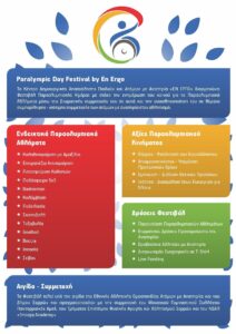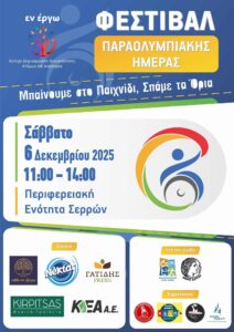 Με αφορμή την Παγκόσμια Ημέρα Ατόμων με Αναπηρία, το Κέντρο Δημιουργικής Απασχόλησης Παιδιών και Ατόμων με Αναπηρία «ΕΝ ΕΡΓΩ» και η Κοινωνική Συνεταιριστική Επιχείρηση Ένταξης Ευάλωτων Ομάδων «ΕΝ ΕΡΓΩ» («ΚΟΙΝ.Σ.ΕΠ.».) διοργανώνουν (για πρώτη φορά στην πόλη των Σερρών) Φεστιβάλ Παραολυμπιακής Ημέρας με τίτλο «Μπαίνουμε στο Παιχνίδι. Σπάμε τα Όρια» το Σάββατο, στις 6 Δεκεμβρίου 2025, και ώρα 11:00-14:00, στον εξωτερικό χώρο που βρίσκεται μπροστά από το κτίριο της Περιφερειακής Ενότητας Σερρών (οδός Κ. Καραμανλή).