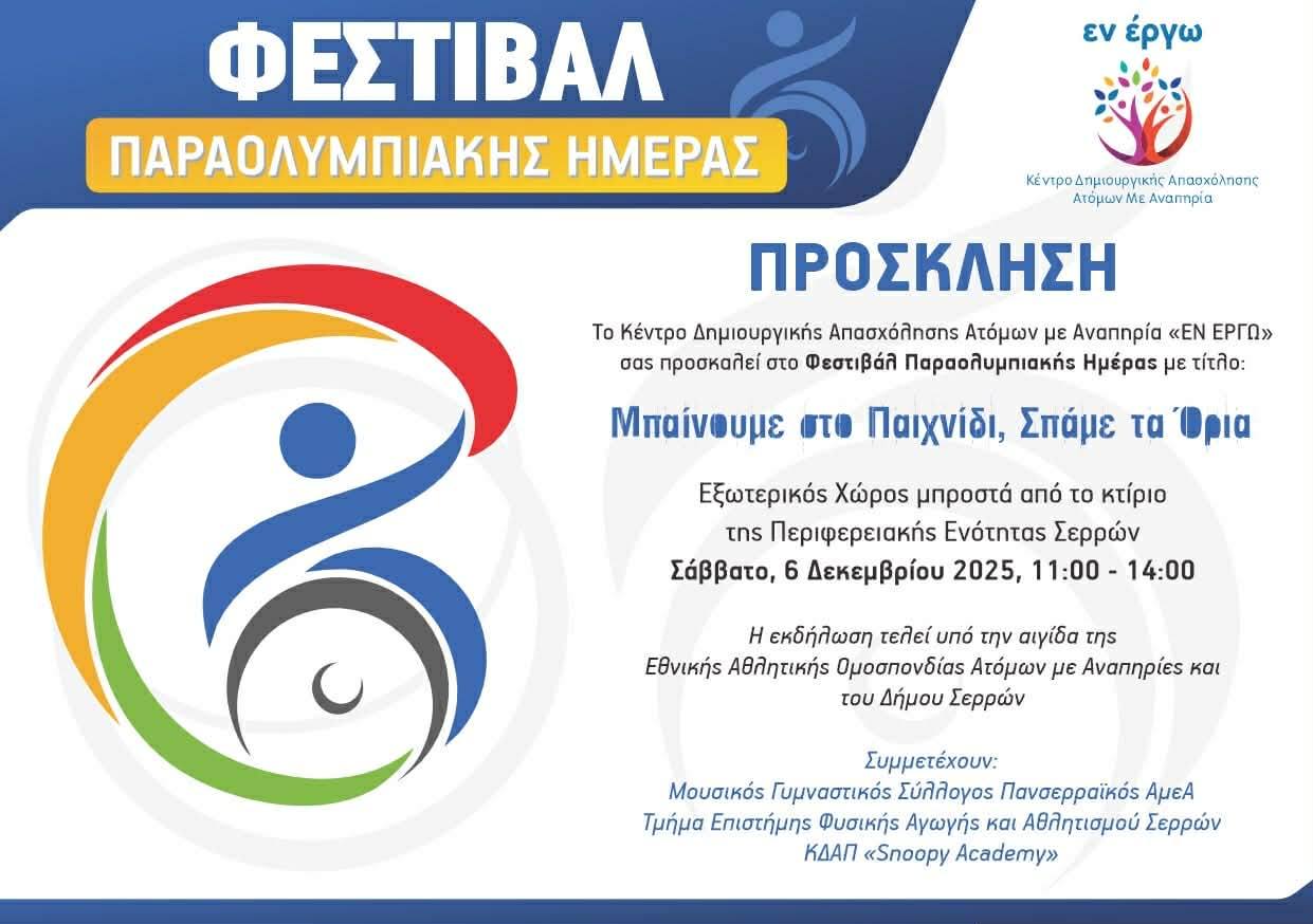 Με αφορμή την Παγκόσμια Ημέρα Ατόμων με Αναπηρία, το Κέντρο Δημιουργικής Απασχόλησης Παιδιών και Ατόμων με Αναπηρία «ΕΝ ΕΡΓΩ» και η Κοινωνική Συνεταιριστική Επιχείρηση Ένταξης Ευάλωτων Ομάδων «ΕΝ ΕΡΓΩ» («ΚΟΙΝ.Σ.ΕΠ.».) διοργανώνουν (για πρώτη φορά στην πόλη των Σερρών) Φεστιβάλ Παραολυμπιακής Ημέρας με τίτλο «Μπαίνουμε στο Παιχνίδι. Σπάμε τα Όρια» το Σάββατο, στις 6 Δεκεμβρίου 2025, και ώρα 11:00-14:00, στον εξωτερικό χώρο που βρίσκεται μπροστά από το κτίριο της Περιφερειακής Ενότητας Σερρών (οδός Κ. Καραμανλή).