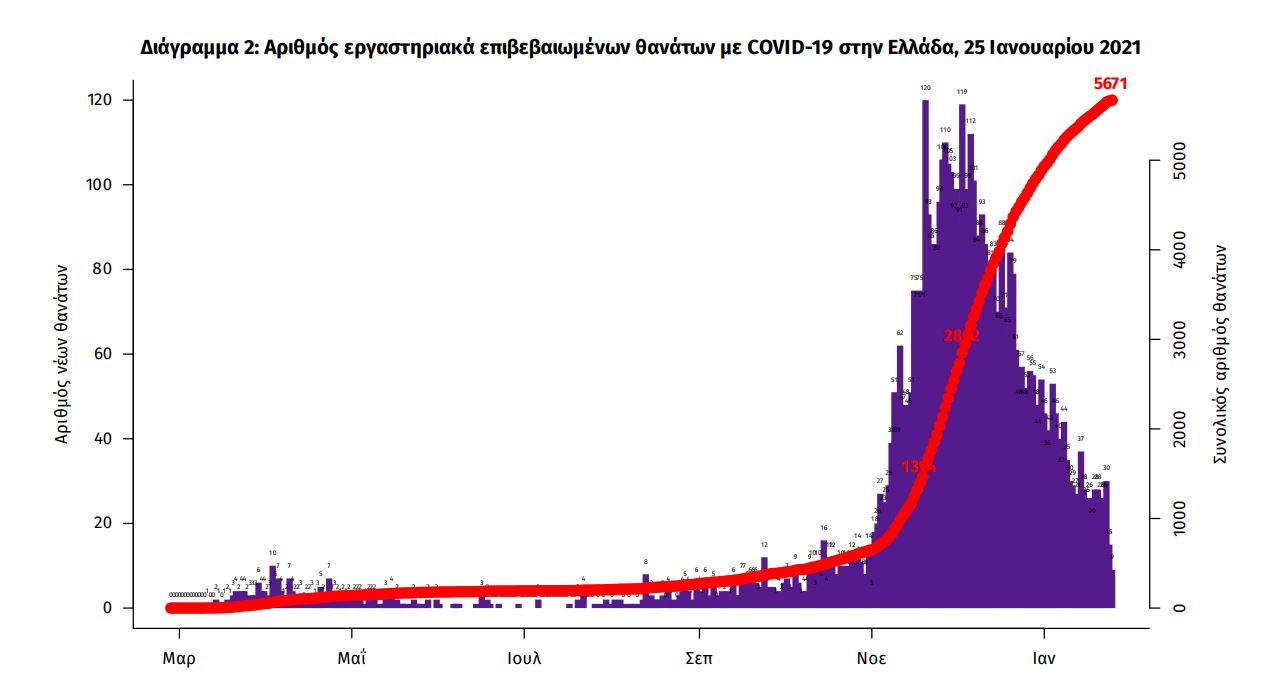 Τέλος, έχουμε 25 νέους θανάτους από τη νόσο COVID-19, φθάνοντας τους 5.671 θανάτους συνολικά στη χώρα, εκ των οποίων 3.343 (58.9%) άνδρες. Η διάμεση ηλικία των θανόντων συμπολιτών μας ήταν τα 79 έτη και το 95.4% είχε κάποιο υποκείμενο νόσημα ή/και ηλικία 70 ετών και άνω.