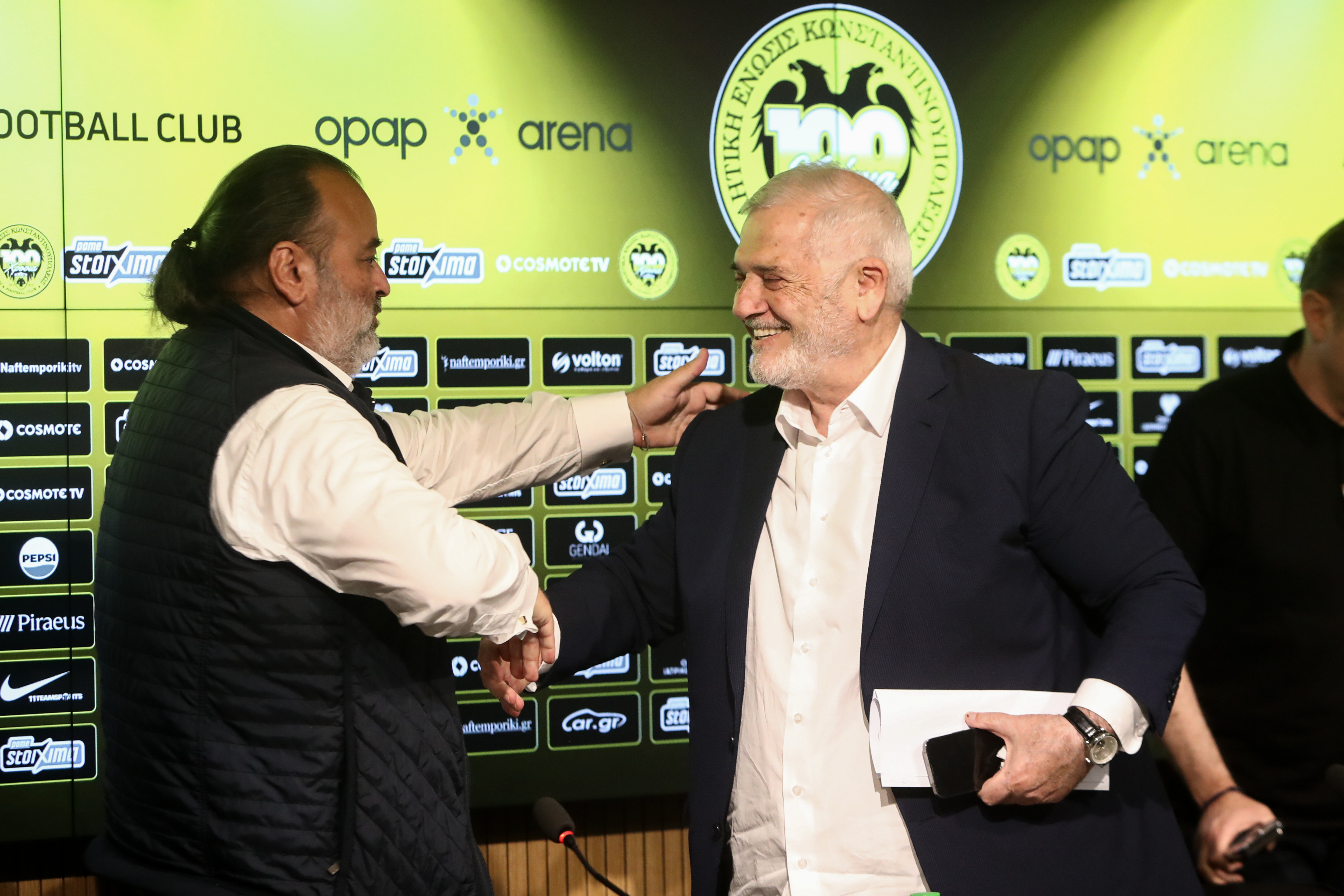«Το ταξίδι έφτασε στο τέλος. Ήρθαμε να σας παρουσιάσω τον κύριο Ηλιόπουλο. Είναι ένας νέος άνθρωπος, ένας νέος προστάτης της ομάδας μας. Το σκέφτηκα πολύ, το δουλεύω ένα με ενάμιση χρόνο στο μυαλό μου. Κατέληξα στον Μάριο γιατί ξέρω τον χαρακτήρα του, ξέρω τις φιλοδοξίες του. Είμαι σίγουρος ότι θα τα καταφέρει. Θα είμαι δίπλα του μέχρι να βρει τον βηματισμό του. Είναι αυτοδημιούργητος, έχει πολλά χρήματα και αισθάνομαι σιγουριά ότι η ΑΕΚ θα έχει συνέχεια».
