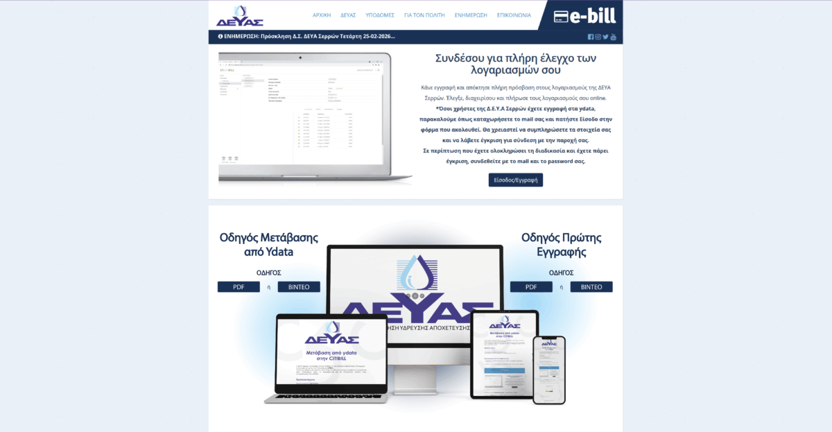 Η ΔΕΥΑ Σερρών ανακοινώνει τη λειτουργία ενός νέου σύγχρονου συστήματος ηλεκτρονικών πληρωμών λογαριασμών μέσω της πλατφόρμας CITIBILL, με στόχο τη διευκόλυνση των πολιτών και τον εκσυγχρονισμό των υπηρεσιών της.