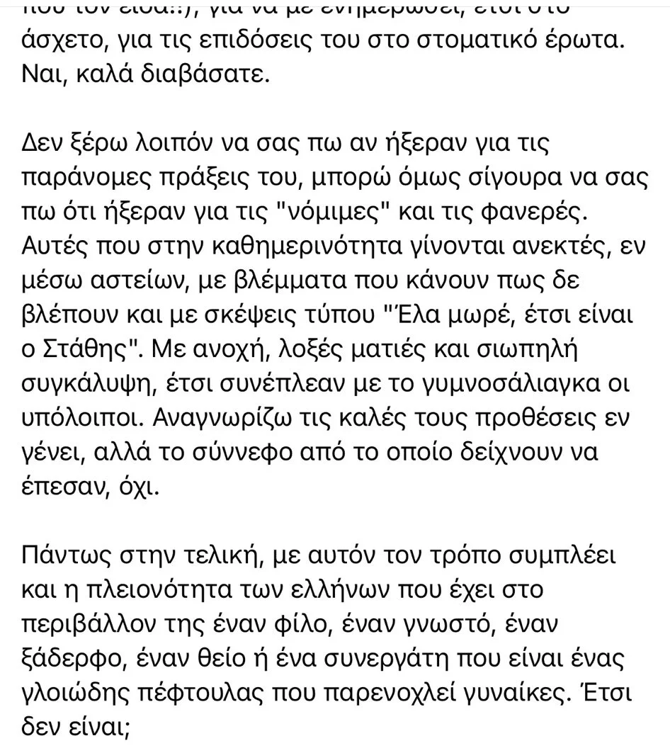 Δεν ξέρω λοιπόν να σας πω αν ήξεραν για τις παράνομες πράξεις του, μπορώ όμως σίγουρα να σας πω ότι ήξεραν για τις “νόμιμες” και τις φανερές. Αυτές που στην καθημερινότητα γίνονται ανεκτές, εν μέσω αστείων, με βλέμματα που κάνουν πως δε βλέπουν και με σκέψεις τύπου “Έλα μωρέ, έτσι είναι ο Στάθης”. Με ανοχή, λοξές ματιές και σιωπηλή συγκάλυψη, έτσι συνέπλεαν με το γυμνοσάλιαγκα οι υπόλοιποι.