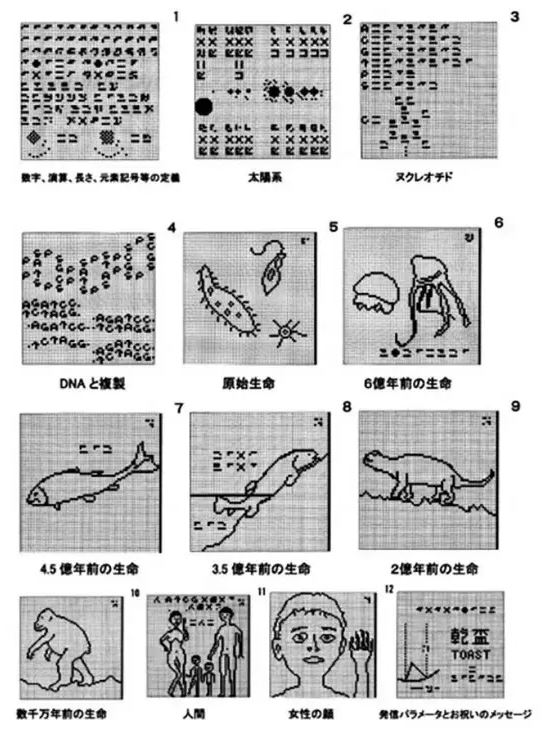 Τα 13 σχέδια που στάλθηκαν στο διάστημα από τους Morimoto και Hirabayashi εξηγούσαν συνοπτικά την ιστορία της Γης, το ηλιακό μας σύστημα και περιλάμβαναν ακόμη και μια εξήγηση για το τι είναι το DNA.