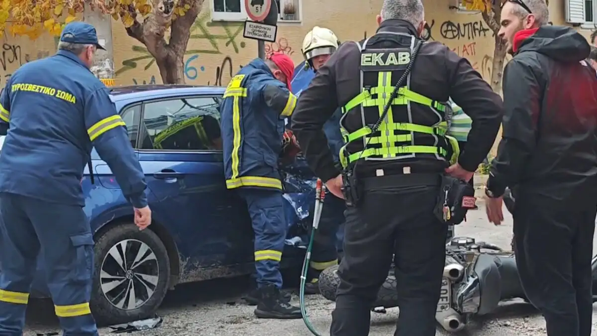 Κατά τη σύγκρουση εγκλωβίστηκε στο εσωτερικό η συνοδηγός του αυτοκινήτου και χρειάστηκε η Πυροσβεστική για να ανοίξει την πόρτα.